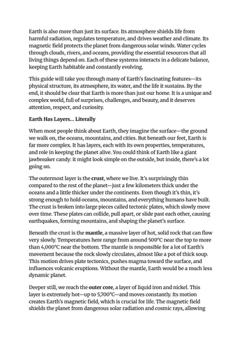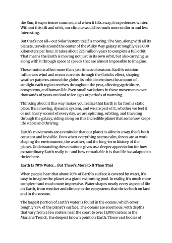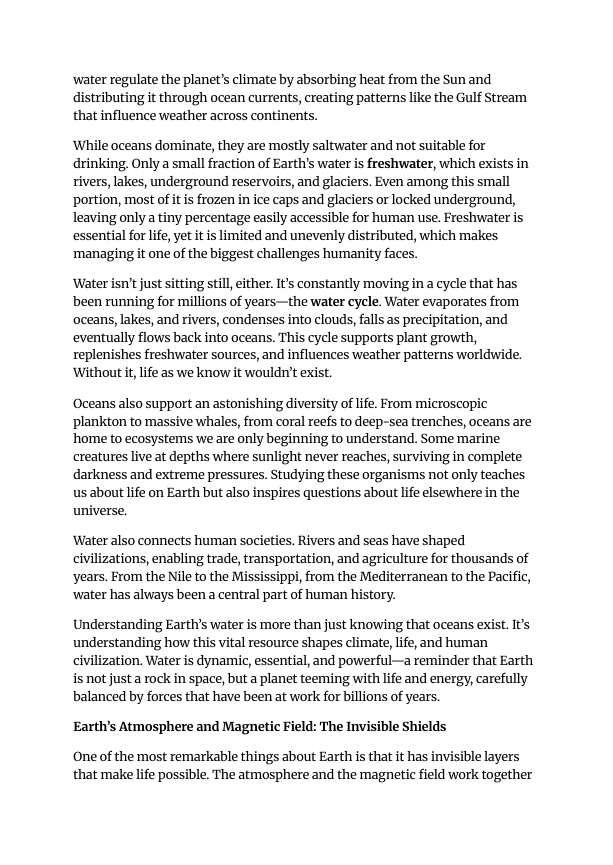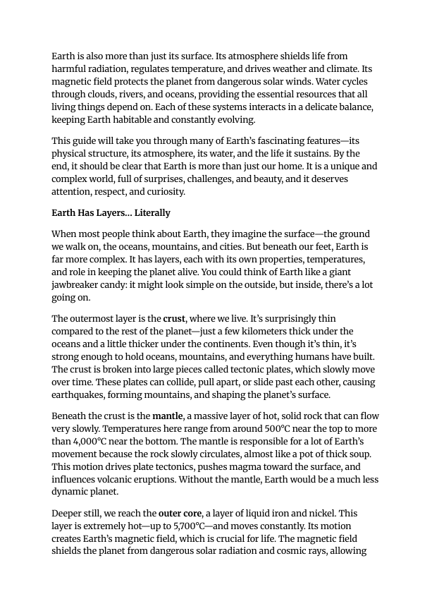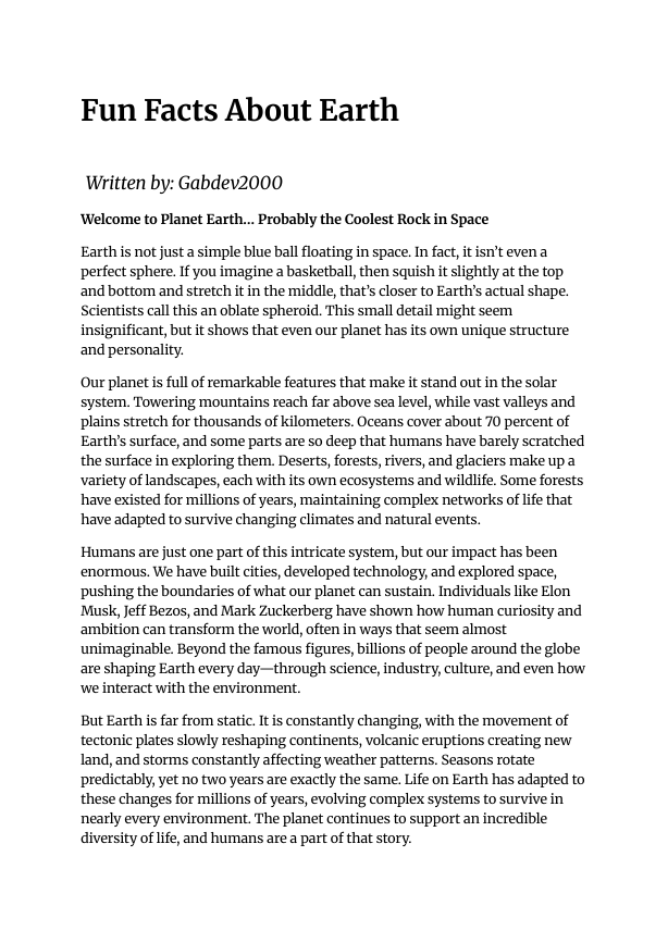 Earth is this giant blue ball that we all live on, just spinning around in space like it owns the place. It’s not even perfectly round—it’s kinda squished at the top and bottom, like someone sat on a basketball. Under our feet, there’s a bunch of layers, from the crust we walk on to a crazy hot core that would literally melt us. Most of the planet is water, and honestly, it’s kinda wild how much of it there is and how deep it goes. The air we breathe and the weather are like Earth’s way of keeping us alive… most of the time. There’s also a magnetic field that protects us from getting fried by the Sun, which is basically Earth’s invisible force field. Mountains, forests, deserts, oceans, and cities all cram together on this spinning rock like a crowded school hallway. Life here is insane and random, from tiny bugs to whales bigger than my house. Earth is constantly moving, spinning, orbiting the Sun, and even riding along with the galaxy like it’s on a cosmic rollercoaster. Basically, Earth is chaotic, kind of terrifying, super cool, and somehow keeps all of us alive without even trying.