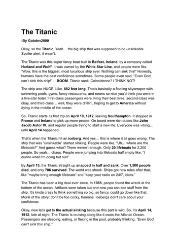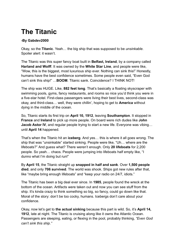 The Titanic was this huge and a super fancy ship that everyone thought could never sink. In 1912, on its very first trip from England to New York, it hit an iceberg and sadly went down, taking over 1,500 people with it.